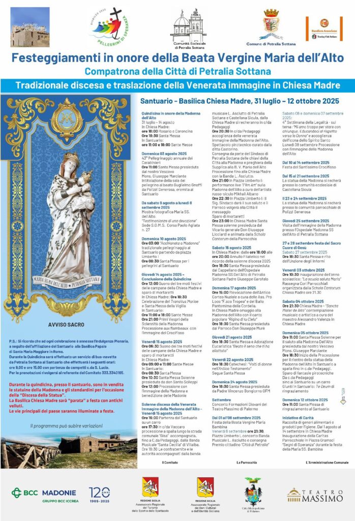 Venerdì 15 agosto 2025, intorno alle ore 16 la Madonna dell’Alto lascerà il suo Santuario su un carro, per essere accolta a Petralia Sottana,(l’arrivo è previsto per le ore 20.30)in un paese addobbato a festa dove il Sindaco consegnerà simbolicamente le chiavi della Città alla Madonna. La processione proseguirà fino alla Chiesa Madre, dove, alle ore 23:00, sarà celebrata una Santa Messa Solenne presieduta dal Vicario Generale della Diocesi di Cefalù Don Giuseppe Licciardi e animata dalla Schola Cantorum parrocchiale.
