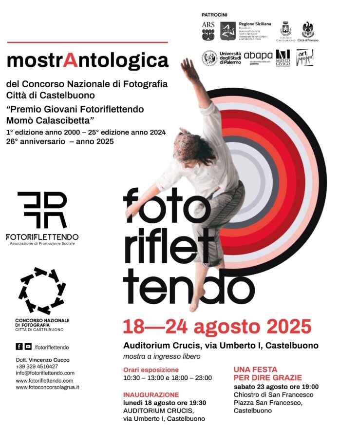 A partire dal giorno 18, alle ore 19,30, fino al 24 agosto 2025, l’Auditorium Crucis, Via Umberto I a Castelbuono ospiterà la mostraAntologica che celebra il lungo percorso del Concorso Nazionale di Fotografia Città di Castelbuono ed il premio giovani Fotoriflettendo “Momò Calascibetta”.Un evento unico che raccoglie le migliori opere selezionate, fra le vincitrici, in 25 anni di concorso senza distinzione di tema o sezione con una particolare attenzione ai giovani talenti.