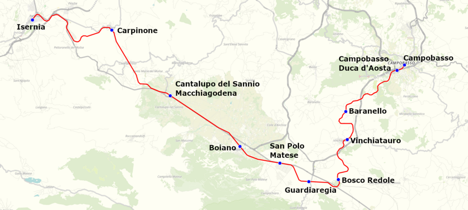 Ferrovia Campobasso-Isernia: linea a binario unico, in corso di elettrificazione. La circolazione è sospesa dal 14 giugno 2020 per consentire lavori; i bus sostitutivi sono attivi. La riapertura, inizialmente prevista per fine 2022, è stata rinviata al 2028. Il primo tratto della ferrovia, da Campobasso a Bosco Redole, è parte della ferrovia Benevento-Campobasso, mentre l’ultimo tratto, tra Carpinone e Isernia, è invece parte della ferrovia Sulmona-Isernia. La linea è stata interessata da lavori di potenziamento nella tratta Campobasso-Boiano, con passaggio dalla tecnologia di supporto alla condotta SSC a quella SCMT, realizzazione della fermata di Campobasso Duca d’Aosta, adeguamento infrastrutturale della stazione di Boiano agli standard correnti, ripristino e adeguamento della stazione di Guardiaregia e della fermata di San Polo Matese nell’ottica del progetto per la realizzazione della Metropolitana leggera Matrice-Campobasso-Bojano. Dal 14 giugno 2020 il traffico ferroviario è sospeso sulla linea a causa dei lavori di elettrificazione. Sono previsti i servizi sostitutivi sulla tratta interessata dai lavori, la cui riapertura, inizialmente prevista per fine 2022, è stata rinviata al 2028. (il tratto Isernia -Carpinone appartiene tecnicamente alla Sulmona -Isernia).