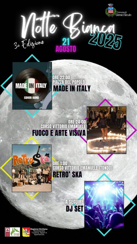 Tutto pronto per la Notte Bianca di Geraci Siculo in programma domani 21 agosto nel borgo madonita in questi giorni pieno di turisti anche in vista della festa patronale in programma nel fine settimana. Tante le iniziative in programma che inizierà intorno alle ore 22 con il concerto dei Made in Italy che ripropongono i maggiori successi di artisti italiani, seguirà uno spettacolo di arte visiva e fuoco,poi ancora musica con i Retro Ska ed infine via al DJ SET per tutta la notte…bianca.