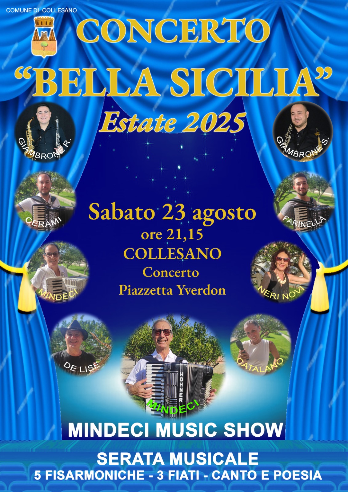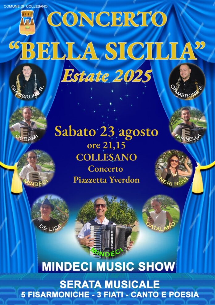 Il tour “Bella Sicilia” organizzato e voluto dal Maestro svizzero Calogero Mindeci, nativo di Resuttano si avvia alla conclusione.Ogni anno il Maestro regala alle sue radici, ai paesi madoniti, la sua musica, facendosi carico di tutti gli oneri relativi ai ragazzi che suonano e cantano con lui.