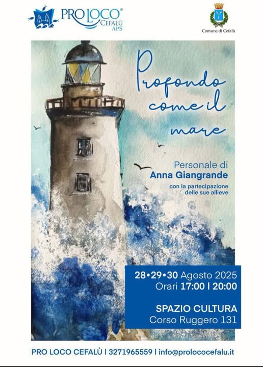 Il 28, 29 e 30 agosto 2025 a Cefalù presso lo Spazio Cultura di corso Ruggiero vengono esposte le opere della pittrice-creator digitale Anna Giangrande. Il tema: “Profonda come il mare”.