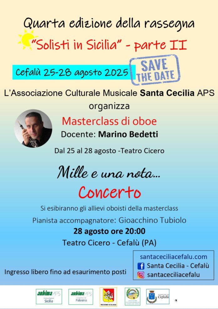 Si conclude questa sera a Cefalù la quarta edizione della rassegna: “Solisti in Sicilia” parte II.L’associazione culturale musicale Santa Cecilia – presidente Cinzia Matassa – ha organizzato presso il teatro Cicero dal 25 al 28 agosto 2025 un Masterclass di oboe, docente Marino Bedetti.A conclusione, alle ore 20:00 questa sera, sempre presso il teatro Cicero, un concerto “Mille e una nota…”degli allievi oboisti della masterclass.