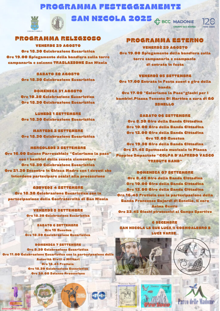HomeEventiAd Insello si festeggia San Nicola di Bari Eventi Ad Insello si festeggia San Nicola di Bari By Redazione Settembre 4, 2025 0 133 Share FacebookTwitterPinterestWhatsApp Entrano nel vivo i festeggiamenti in onore di San Nicola di Bari,patrono del comune madonita,in programma da venerdi 5 a domenica 7 settembre. Di seguito il programma completo degli eventi religiosi e degli spettacoli. Correlati Share FacebookTwitterPinterestWhatsApp Previous articleIncidenti sul lavoro. Vega: ben 607 dall’inizio dell’annoNext articlePollina. Servizi gratuiti per gli anziani. Scadenza domanda Redazione RELATED ARTICLES Eventi Tutto pronto per la quarta edizione della Sagra dell’olio extravergine d’oliva e la mandorla Pizzuta a Montemaggiore Belsito Novembre 8, 2025 Eventi Associazione Italiana Sommelier: 60 anni di vita Novembre 7, 2025 Eventi Al via gli abbonamenti per la nuova stagione teatrale al Grifeo Novembre 6, 2025 Advertisment - Advertisment - ULTIME NOTIZIE Madonie, disarticolata piazza di spaccio:26 denunciati Novembre 8, 2025 Petralia Sottana,era il novembre del 1908 e luce fu. Novembre 8, 2025 Tutto pronto per la quarta edizione della Sagra dell’olio extravergine d’oliva e la mandorla Pizzuta a Montemaggiore Belsito Novembre 8, 2025 Basilica Cattedrale. I Santi della porta accanto Novembre 8, 2025 Load more Advertisment Advertisment