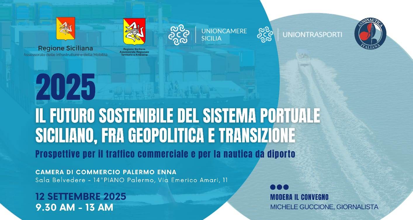 Appuntamento venerdì 12 settembre, alle ore 9,30, presso la Sala Belvedere al 14esimo piano della Camera di commercio Palermo Enna, in via Emerico Amari, 11, a Palermo,  con l’evento “Il futuro sostenibile del sistema portuale siciliano, fra geopolitica e transizione”, organizzato da Unioncamere Sicilia, Uniontrasporti e Assonautica nell’ambito del  Programma Infrastrutture finanziato dal Fondo perequativo 2023-2024 di Unioncamere nazionale.