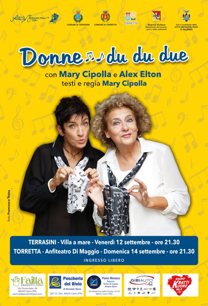 E’ il Teatro di Mary Cipolla e Alex Elton che approda a Terrasini e a Torretta con lo spettacolo DONNE DU DU DUE rispettivamente venerdi 12 e domenica 14 settembre, poi c’è anche un incontro a Carini con giovani appassionati di Teatro sabato 13 settembre. Gli eventi sono tutti gratuiti, per il workshop i giovani partecipanti dovranno iscriversi, fino ad esaurimento posti, contattando l’Associazione Fata Morgana tramite mail (ass.fatamorgana20@gmail.com) specificando nome cognome e num di telefono. L’evento è stato organizzato dall’Associazione col sostegno della Città Metropolitana di Palermo, dei Comuni interessati e di ditte sponsorizzatrici.