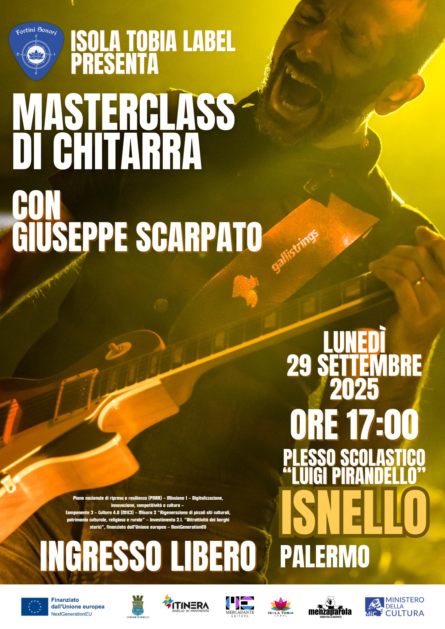 Il 29 settembre a Isnello (PA) si terrà una masterclass di chitarra gratuita con Giuseppe Scarpato, chitarrista, produttore e compositore napoletano.La masterclass, organizzata da Isola Tobia Label nell’ambito del progetto Itinera, si svolgerà, dalle 17.00, presso il Laboratorio di musica della Nuova Scuola “Luigi Pirandello”.