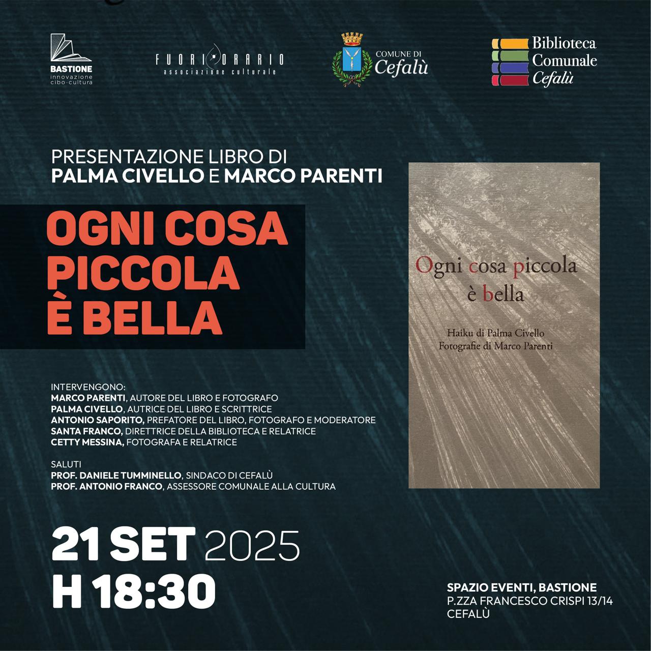 Domenica 21 settembre ore 18:30 presso lo Spazio Eventi del Bastione, Cefalù, viene presentato il libro di poesia e foto: “Ogni cosa piccola è bella” di Palma Civello e Marco Parenti.Dopo il saluto del sindaco Daniele Tumminello e dell’assessore alla cultura Antonio Franco, sono previsti gli interventi degli autori Civello e Parenti, di Antonio Saporito, Cetty Messina e di Santa Franco, direttrice della biblioteca comunale.Il libro Ogni cosa piccola è bella – dice Santa Franco – scritto da Palma Civello con le fotografie di Marco Parenti, è un esempio potente e delicato di come la forma haiku possa vivere, respirare e risplendere anche al di fuori del Giappone, restando però fedele allo spirito originario.