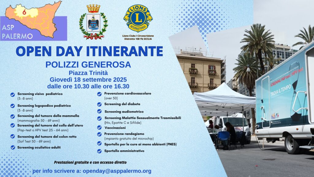 L’Open day itinerante domani (giovedì 18 settembre) i camper dell’Open day itinerante dell’Asp faranno tappa a Polizzi Generosa dove, dalle 10.30 alle 16.30, in Piazza Trinità gli utenti delle Madonie potranno effettuare esami e visite di screening gratuite.