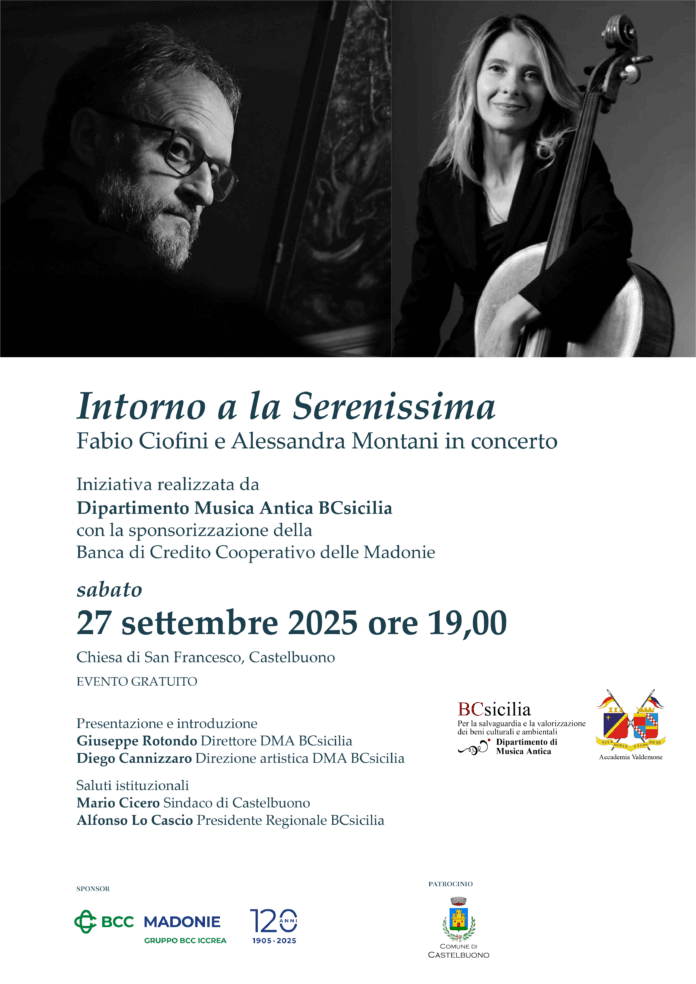 Prosegue la Stagione concertistica 2025 di BCsicilia con un nuovo appuntamento dal forte respiro europeo. Sabato 27 settembre 2025, alle ore 19.00, la Chiesa di San Francesco di Castelbuono accoglierà il concerto “Intorno a la Serenissima”, con protagonisti Fabio Ciofini e Alessandra Montani.