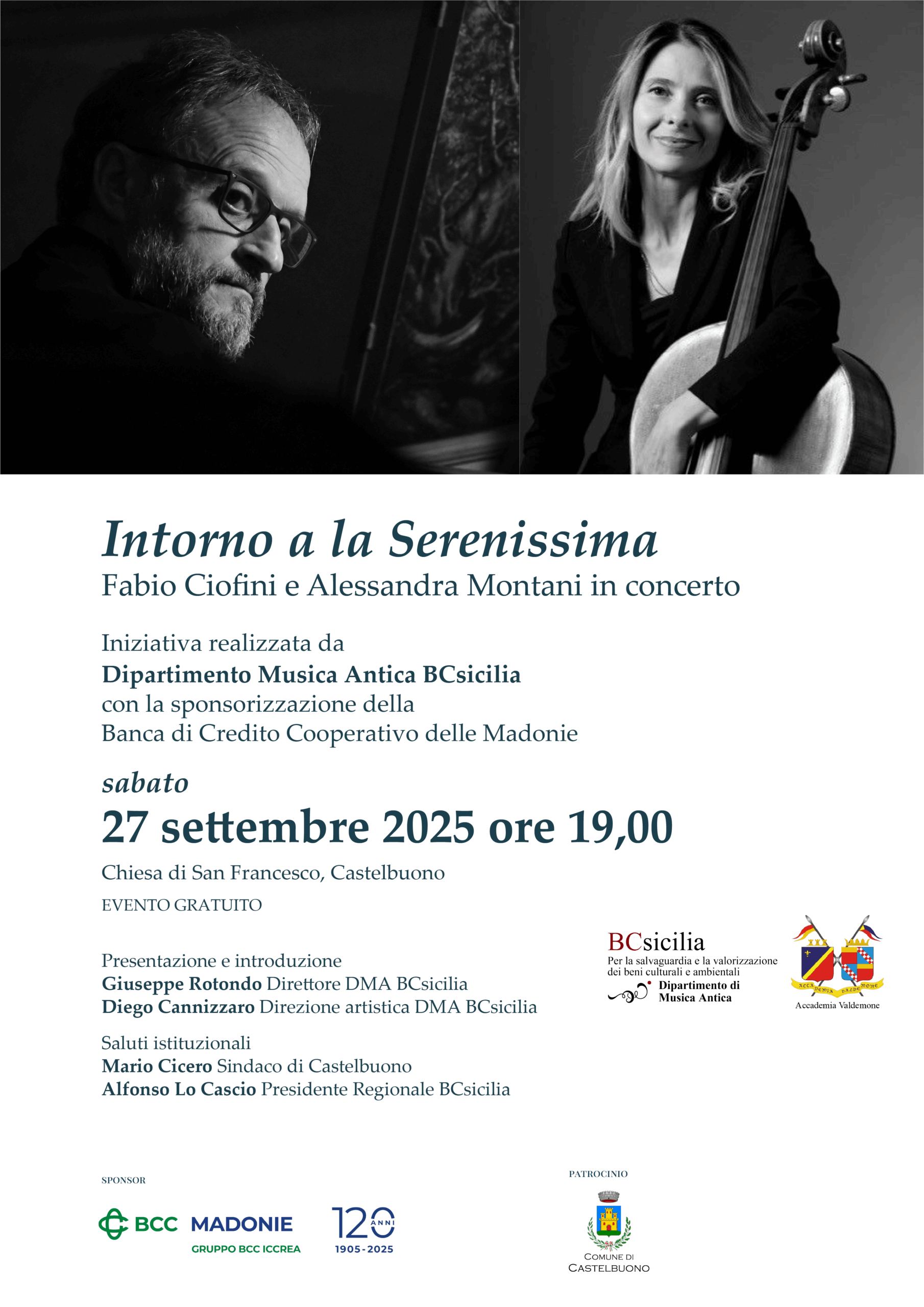 Stagione concertistica BCsicilia 2025: sabato 27 settembre Fabio Ciofini e Alessandra Montani in concerto nella Chiesa di San Francesco, Castelbuono,Intorno a la Serenissima