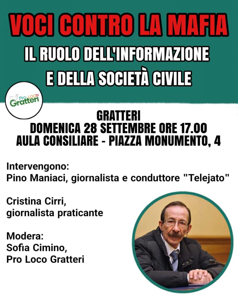 La lotta alla mafia passa anche dalla forza della parola e dal coraggio di raccontare la verità. Con questo spirito si terrà a Gratteri domenica 28 settembre alle ore 17:00, presso l’Aula Consiliare di Piazza Monumento, l’incontro pubblico dal titolo “Voci contro la mafia – Il ruolo dell’informazione e della società civile”, promosso dalla Pro Loco Gratteri.