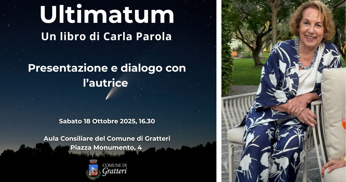Il Comune di Gratteri ospita, con il proprio patrocinio, la presentazione del libro Ultimatum di Carla Parola, scrittrice e ricercatrice spirituale, autrice di opere che indagano il rapporto tra consapevolezza, energia e trasformazione interiore.