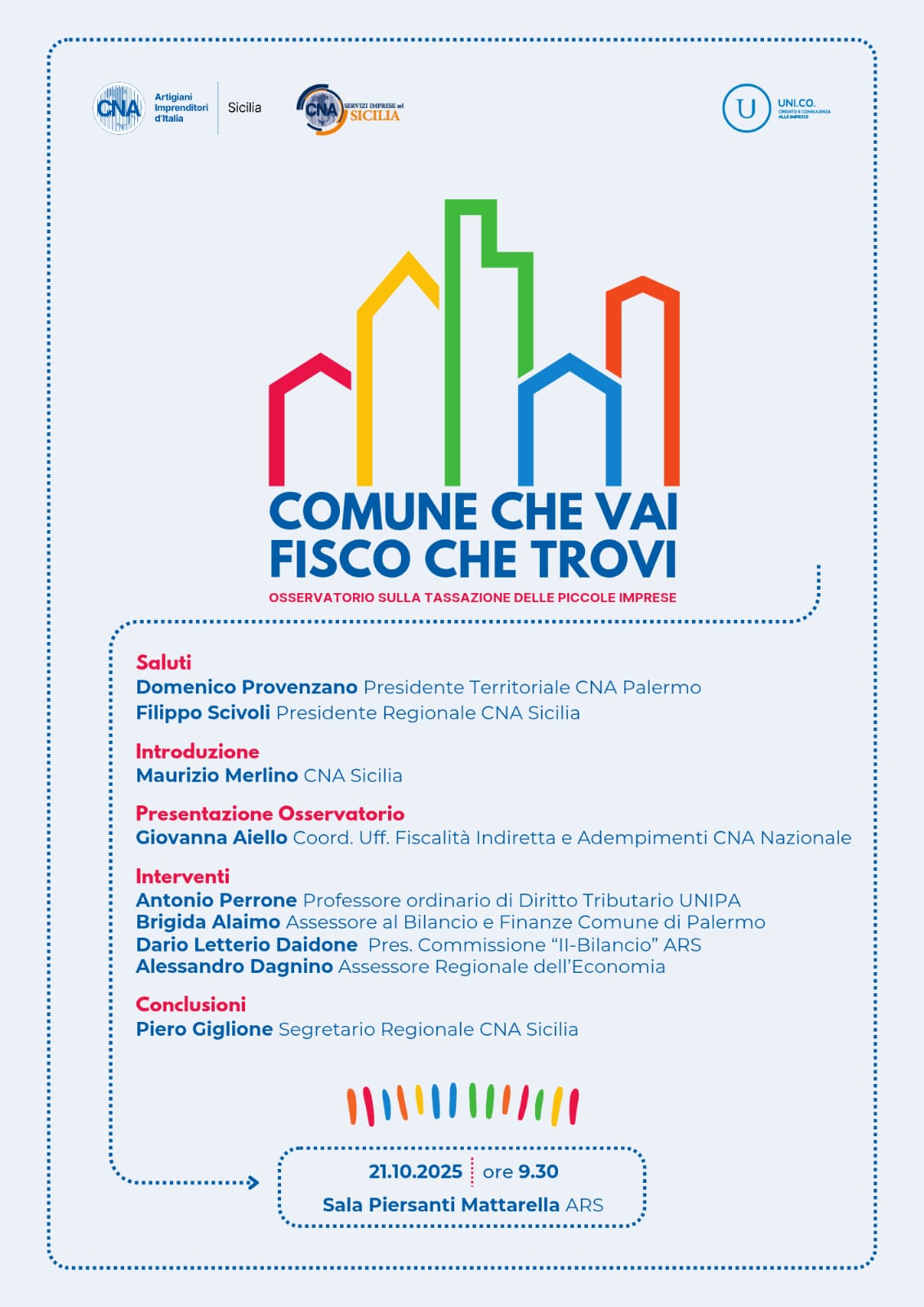 CNA Sicilia presenterà il Rapporto “Comune che vai, fisco che trovi”, realizzato dall’Osservatorio sulla tassazione delle piccole imprese del Dipartimento politiche fiscali e societarie di CNA. L’evento, dedicato alle dinamiche fiscali che interessano le realtà imprenditoriali più piccole del territorio, si terrà martedì 21 ottobre 2025, alle ore 9.30, presso la Sala Piersanti Mattarella dell’Assemblea Regionale Siciliana a Palermo.