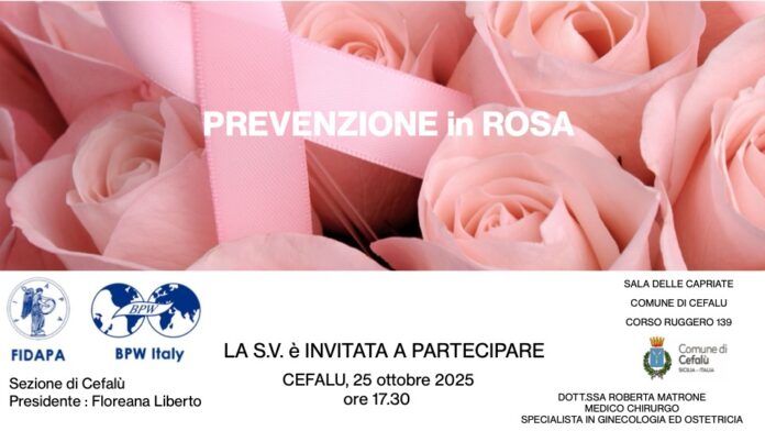 Nell’ambito dell’ottobre in rosa e con il patrocinio del Comune di Cefalù, la Fidapa BPW Italy, sezione di Cefalù – presidente Floreana Liberto – promuove l’iniziativa “Prevenzione in rosa”, rivolgendo l’attenzione alle tematiche ginecologiche femminili, con la partecipazione della Dott.ssa Roberta Matrone, medico chirurgo, specialista in ginecologia ed ostetricia. Sabato 25 ottobre 2025 ore 17.30 presso la Sala delle Capriate del Comune di Cefalù, corso Ruggiero 139, la cittadinanza è invitata a partecipare, indossando un accessorio di colore rosa.