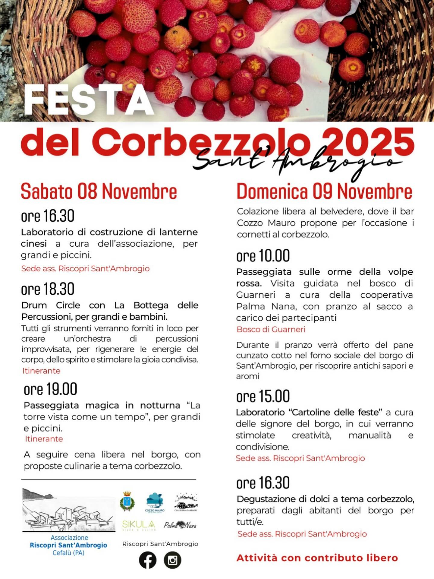 Scopri il gusto del corbezzolo, lasciati coinvolgere dalla magia del borgo e vivi due giorni all’insegna della comunità e della gioia. Sant’Ambrogio – Cefalù, 8–9 Novembre 2025 – Dunque Sabato 8 e domenica 9 novembre Sant’Ambrogio aspetta tutti con laboratori creativi, passeggiate tra boschi e musica condivisa, per grandi e piccini