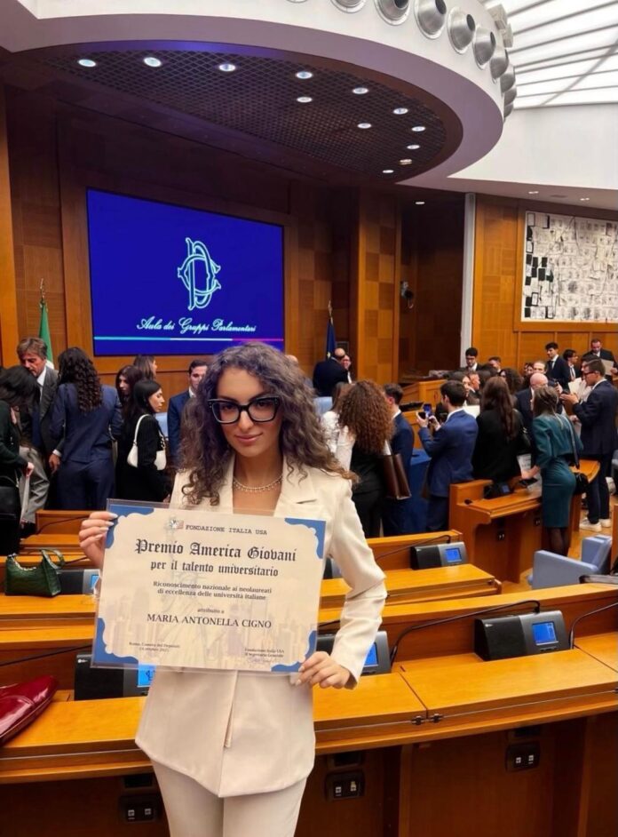 Il Sindaco e l’Amministrazione comunale di Gangi si congratulano con la nostra giovane concittadina Maria Antonella Cigno per il prestigioso riconoscimento ottenuto dalla Fondazione Italia USA.Grazie al suo brillante percorso accademico, dopo la laurea in Scienze delle Amministrazioni e delle Organizzazioni complesse, Maria Antonella è stata selezionata per l’assegnazione del Premio America Giovani per il talento universitario, un riconoscimento nazionale che valorizza i neolaureati di eccellenza delle Università italiane.