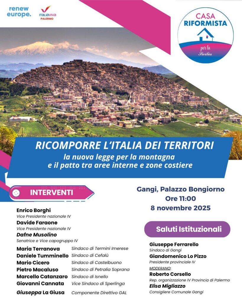 L’8 novembre a Gangi alle ore 11 presso il Palazzo Bongiorno cercheremo di fare uscire delle proposte concrete per i nostri territori e lo faremo con chi si misura quotidianamente con i problemi delle Città e del Paese, Sindaci e Parlamentari discuteranno della nuova legge per la montagna, delle opportunità e di come si può rinsaldare il rapporto tra mare e montagna – così il presidente provinciale di Italia Viva – continueremo a lottare perché i nostri paesisi salvino e non diventino “città museo””.