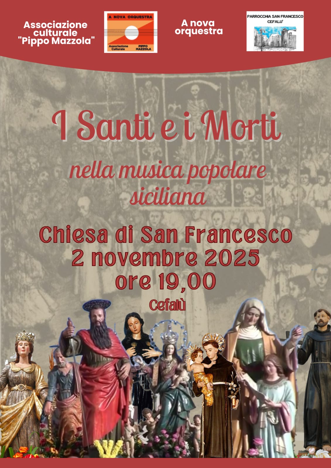 Domenica 2 novembre alle 19:00 a Cefalù, nella chiesa di San Francesco – parroco fra’ Aurelio Biundo – avrà luogo l’evento musicale “I santi e i morti nella tradizione popolare siciliana”. Canti popolari siciliani che manifestano la fede nei riguardi di tanti fratelli e sorelle sante.Durante il concerto il gruppo “A nova Orquestra” eseguirà brani delle tradizioni di tutta la Sicilia che venivano o vengono ancora eseguiti in occasione della ricorrenza dei defunti e delle feste dei santi celebrati nei vari centri dell’isola; verranno anche riproposti alcuni racconti, preghiere e grida che costellano le varie celebrazioni, e che caratterizzano, per la grande diversità di struttura musicale ed esecuzione, le celebrazioni dei Santi e dei morti nelle varie località.