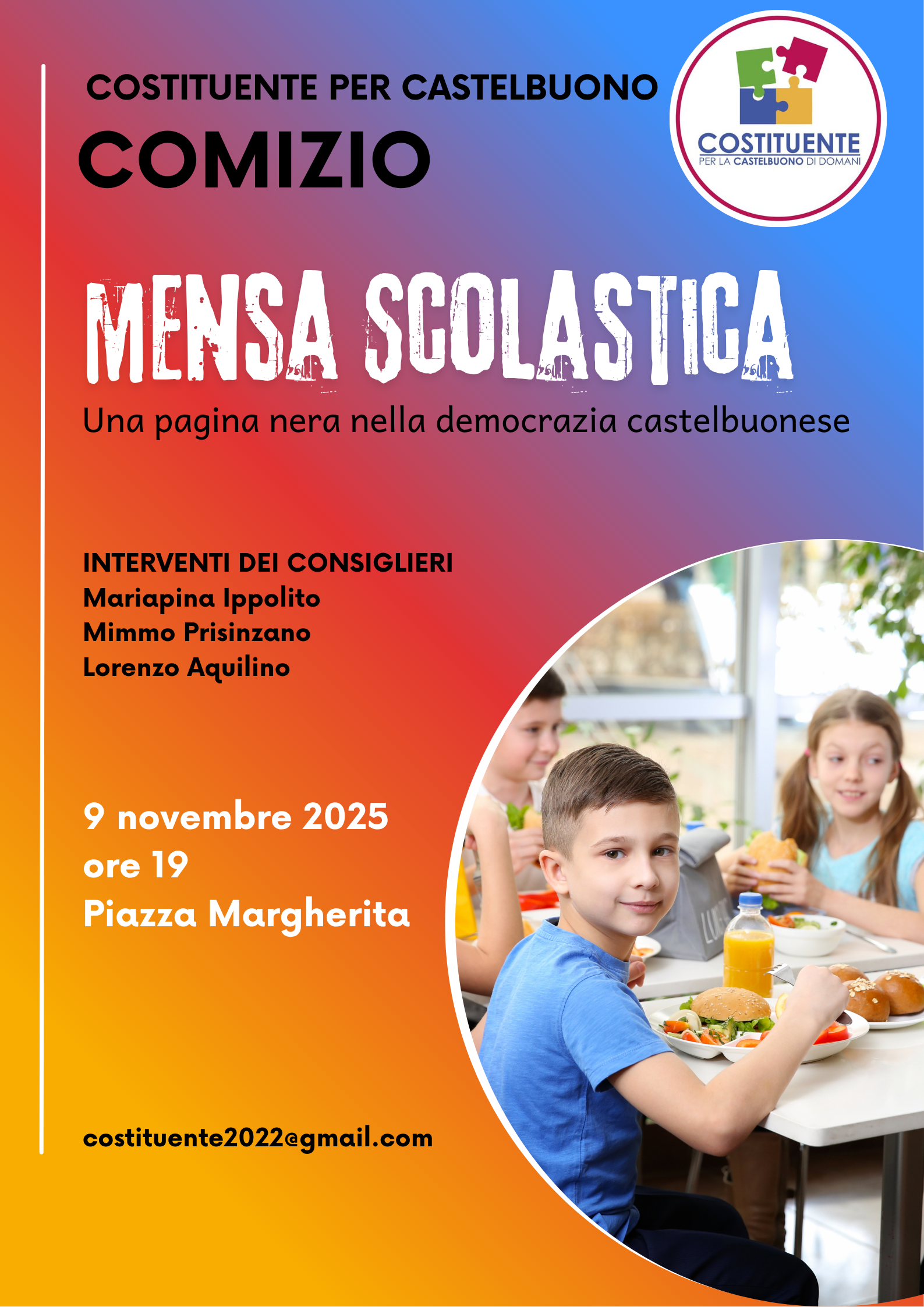 Care concittadine e cari concittadini, la Costituente torna in piazza con i suoi consiglieri, per parlare del servizio di refezione scolastica e della pagina nera per la Democrazia scritta dalla maggioranza nell’ultimo Consiglio comunale.