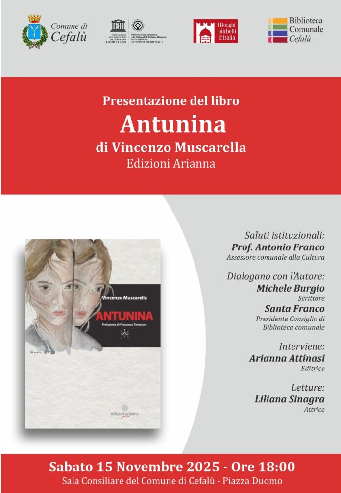 Sabato 15 Novembre, alle 18:00, nella Sala Consiliare di Cefalù viene presentato “Antunina” (Edizioni Arianna) il terzo romanzo della trilogia “Tri Matri” di Vincenzo Muscarella.Dentro le pagine di un romanzo la storia drammatica di una donna della nostra terra, Antunina, narrata con delicatezza e sensibilità da Enzo Muscarella, uno scrittore siciliano che incanta il lettore per la bellezza del suo stile.Romanzo storico dell’emigrazione forzata verso la “Merica”, mediata dalla criminalità mafiosa, dopo la repressione del Movimento dei Fasci Siciliani.
