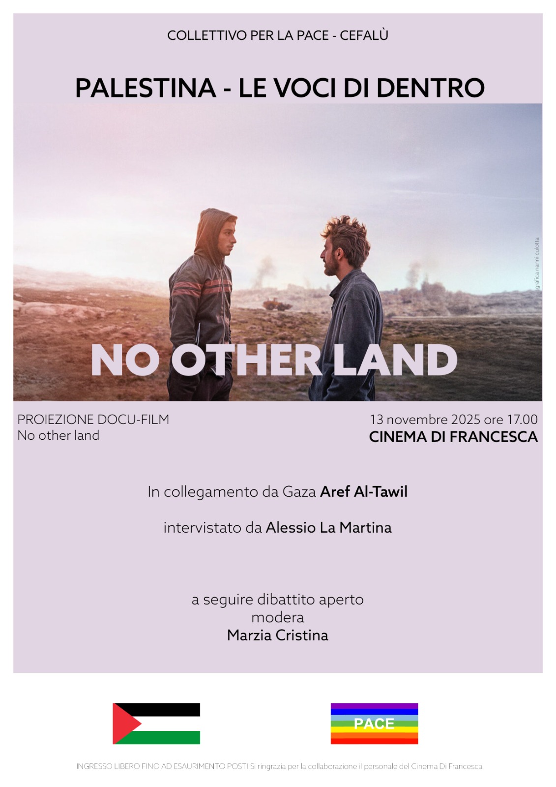 Nel corso dell’ evento sarà proiettato il docufilm “No other Land”, premiato con l’Oscar e con il Gotham Award come miglior documentario, girato da un collettivo israelo-palestinese di quattro registi: Basel Adra, Yuval Abraham, Hamdam Ballal e Rachel Szor.