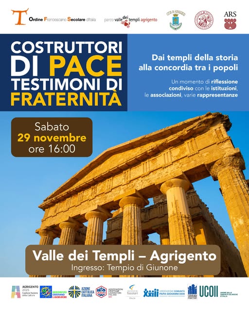 Per questo, come Ordine Francescano Secolare d’Italia, si darà vita all’evento “Costruttori di Pace, Testimoni di Fraternità”: un momento di riflessione e preghiera condivisa nella suggestiva Valle dei Templi di Agrigento, a margine della nostra assemblea nazionale.