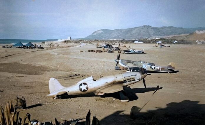 Circa il campo di volo avanzato denominato ALG East, sappiamo con certezzache sitrovava in prossimità dell’abitato di Campofelice di Roccella , tuttavia, oggi, questo campo improvvisato americano è ancora da individuare e localizzare con precisione. La pista di atterraggio campofelicese fu allestita dopo quella di Termini Imerese, infatti, l’ALG West, sita nella località termitana di “Canne Masche”, era stata approntata sul finire del luglio 1943, su un preesistente campo di fortuna, probabilmente utilizzato in precedenza dalla Regia Aeronautica (1). Nel 2016, grazie ad una foto in bianco e nero, segnalataci dal giornalista Gaetano Messina (2), avevamo reso noto ai nostri lettori, il complesso aeroportuale (ALG East), anch’esso predisposto dal XII Engineer Command statunitense. In data odierna, invece, ripubblichiamo la stessa versione fotografica (verosimilmente, alterata a colori digitalmente), trovata e scaricata da internet. Questa probabile “foto ricolor” conferisce all’osservatore quell’illusione visiva di quest’altro punto di appoggio aereo a “stelle e strisce”, oramai non più esistente, che ricordiamo, si articolava su due satelliti: Est e Ovest, entrambi i quali, funsero da testa di ponte per le operazioni Baytown e Avalanche. Per la descrizione fotografica ci avvaliamo anche questa volta di Donaldo Di Cristofalo (3), esperto in storia militare.