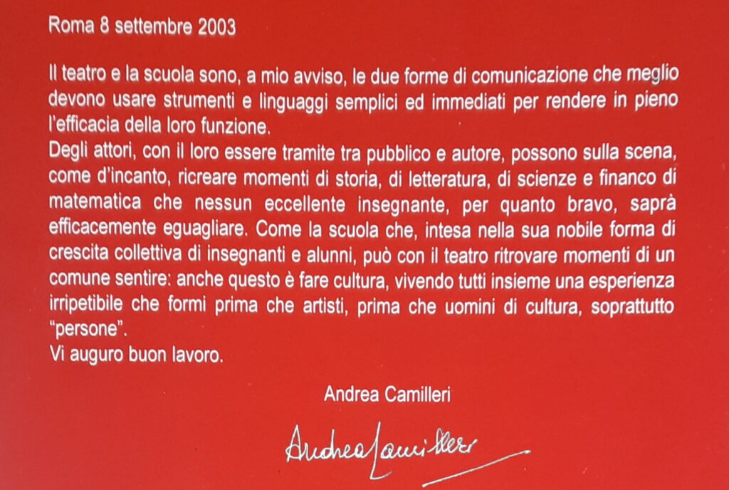 Appena pochi giorni prima dell’appuntamento con Camilleri a Pollina, lo stesso mi comunica, con sincero rammarico, che una brutta influenza lo inchioda in casa, che davvero lo rincresce mancare questo appuntamento, in particolare con i tantissimi giovani, pertanto mi pregava di leggere a suo nome sul palco una nota che mi avrebbe inviato.Mi sono ricordata di tutto ciò, mentre stavo preparando la lettura corale dall’opera di Camilleri per il 25 novembre scorso, per l ‘Omaggio ad Andrea Camilleri 100, per la città di Halle, in Germania, per il Festival Autunno Italiano 8^ edizione, di cui, benchè decaduta dal mio ruolo, ne ho ancora curato l’edizione corrente.Nel ricordare l’evento del 2003 mi sono improvvisamente ricordata, che di quella seconda edizione di “Un Teatro Per la Scuola – Le Scuole per un Teatro”, ne avevamo fatto anche una deliziosa pubblicazione, con in prima pagina, appunto, la nota autografa di Camilleri, che lui mi aveva fatto pervenire.Ho cercato la pubblicazione che non avevo più avuto tra le mani almeno per un ventennio, la ho trovata e mi sono molto emozionata nel leggere le sue parole, colme della sensibilità, dell’umanità e della saggezza, di cui era capace e solito donarsi.