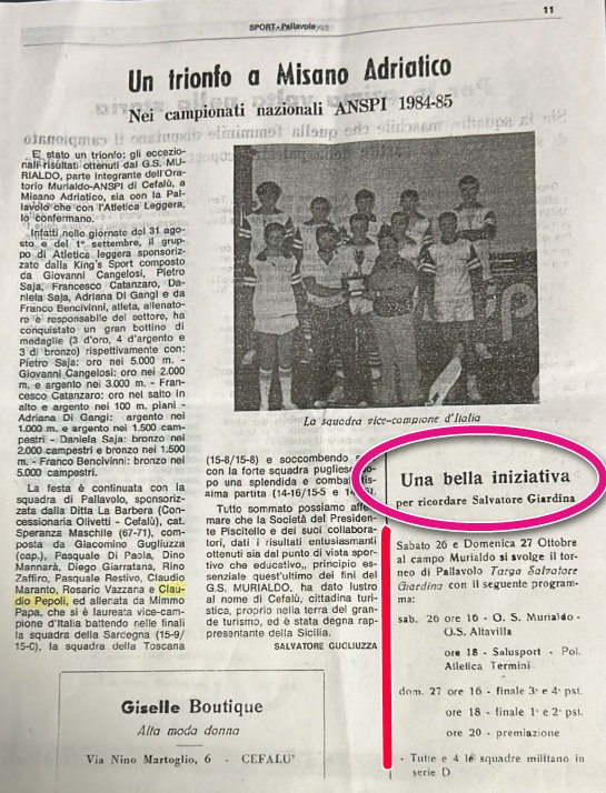 Un tuffo nella storia: Oggi vi proponiamo un reperto davvero speciale: un articolo del 1984/1985, pubblicato dal periodico G.S.Murialdo, giornale della Parrocchia SS.Salvatore alla Torre, G.S.Murialdo, Oratorio Murialdo, Circolo Anspi, direttore Carlo Antonio Biondo, che celebra la I edizione del Torneo in onore di Salvatore Giardina.