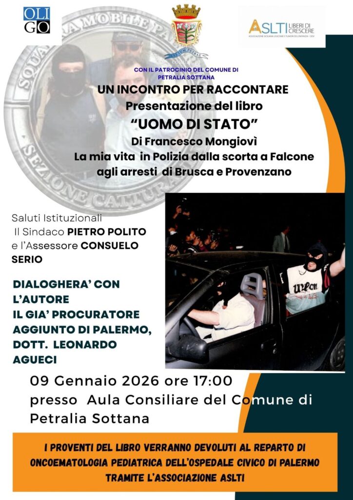 Venerdi 9 Gennaio alle ore 17 presso l’aula consiliare di Petralia Sottana sarà presentato il libro “Uomo di Stato” di Francesco Mongiovì,un racconto dell’autore già scorta di Falcone e fino agli arresti di Brusca e Provenzano. Sarà presente all’incontro, oltre l’autore del libro, anche l’ex Procuratore di Palermo Leonardo Agueci.