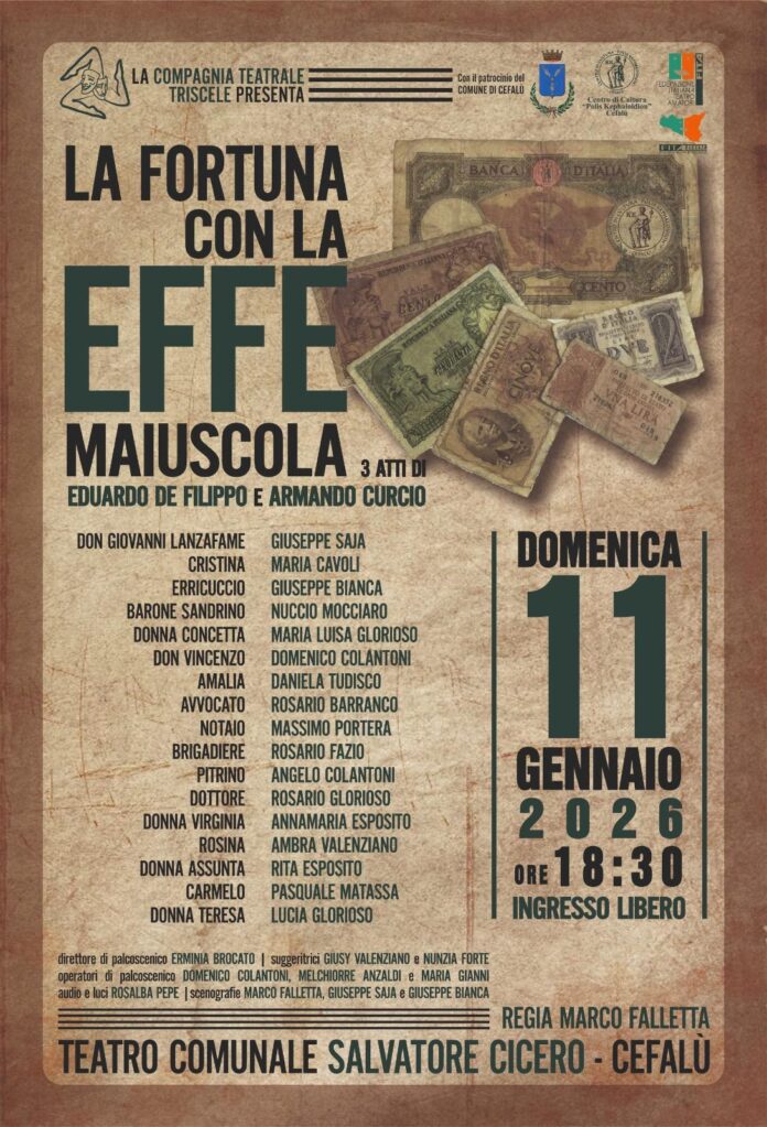 Al Teatro Comunale Salvatore Cicero, domenica 11 gennaio alle ore 18:30, andrà in scena La fortuna con la EFFE maiuscola, brillante commedia in tre atti di Eduardo De Filippo e Armando Curcio, con la regia di Marco Falletta, uno spettacolo che non solo arricchisce il calendario teatrale locale, ma offre anche un’importante occasione di partecipazione e condivisione culturale per l’intera comunità cefaludese, consolidando il ruolo del teatro come luogo di incontro e dialogo tra generazioni.