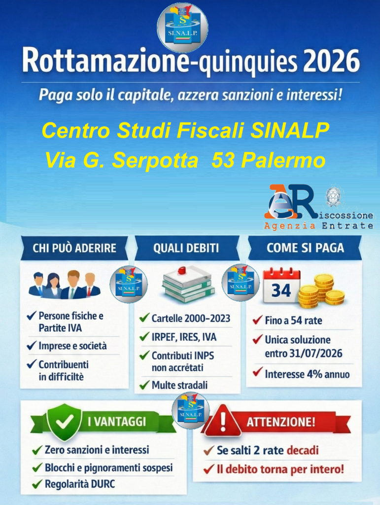 La Segreteria Regionale del SI.NA.L.P. Sicilia accoglie con grande favore le misure introdotte dalla Legge di Bilancio 2026 in materia di riscossione, riconoscendo nella Rottamazione-quinquies uno strumento fondamentale di giustizia sociale, riequilibrio economico e rilancio produttivo.La nuova definizione agevolata rappresenta una vera tregua fiscale per migliaia di famiglie, lavoratori autonomi, dipendenti, pensionati e piccole imprese, troppo spesso soffocati da debiti cresciuti in modo sproporzionato a causa di sanzioni, interessi di mora e aggio, con l’unico risultato di distruggere il contribuente e rendere il credito, di fatto, inesigibile.