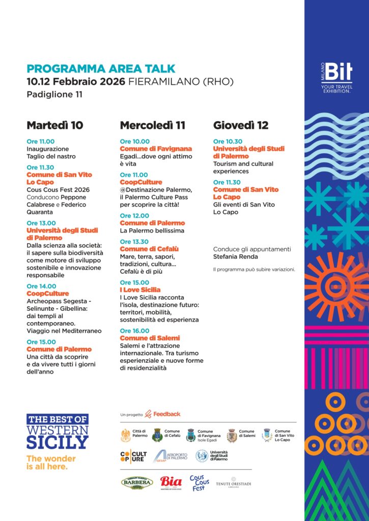 Il programma si apre domani, martedì 10 febbraio alle ore 11 con l’inaugurazione ufficiale e il taglio del nastro. Alle 11.30, San Vito Lo Capo presenta l’edizione 2026 del Cous Cous Fest, evento iconico riconosciuto a livello internazionale come modello di dialogo tra culture attraverso il cibo. Alle 13.00, l’Università degli Studi di Palermo propone un focus sul valore della biodiversità come motore di sviluppo sostenibile, attraverso il progetto Biodiversity Gateway. Nel pomeriggio, CoopCulture presenta ArcheoPass Segesta – Selinunte – Gibellina, percorso che mette in dialogo archeologia, arte e architettura contemporanea, seguito dall’appuntamento del Comune di Palermo, che racconta la città come destinazione viva tutto l’anno.