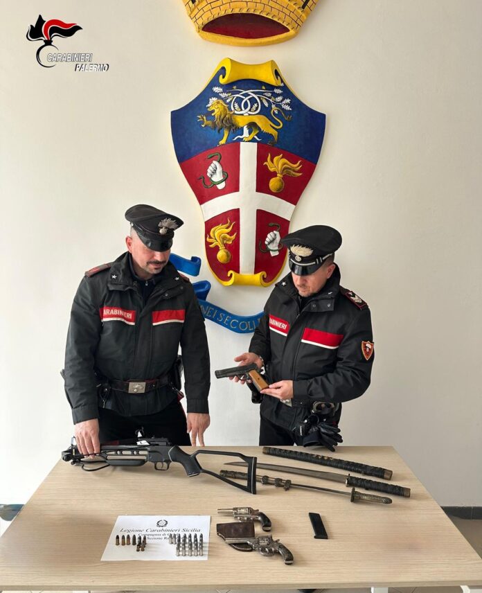 Sono stati rinvenuti due revolver a tamburo di cui uno senza matricola, una pistola scacciacani priva di tappo rosso, 26 munizioni calibro 38 e 5 calibro 7,65, due katane affilate e una balestra.