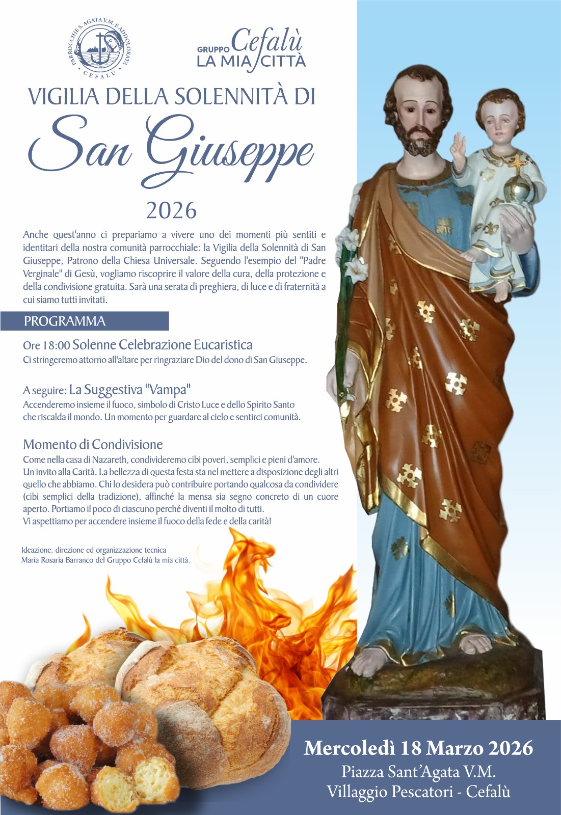 A cura della Parrocchia S.Agata Vergine e Martire e Addolorata della Ferla e del Gruppo “Cefalù la mia città”, mercoledì 18 marzo 2026, piazza Sant’Agata, Villaggio Pescatori, Cefalù, anche quest’anno ci si prepara a vivere uno dei momenti più sentiti e identitari della comunità parrocchiale: la Vigilia della Solennità di San Giuseppe, Patrono della Chiesa Universale.Seguendo l’esempio del “Padre Verginale” di Gesù, si intende riscoprire il valore della cura, della protezione e della condivisione gratuita. Sarà una serata di preghiera, di luce e di fraternità a cui si è tutti invitati.