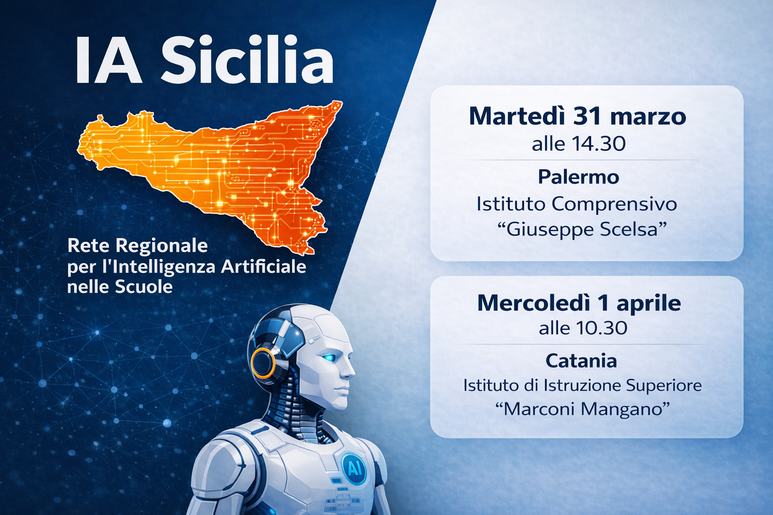 L’Intelligenza Artificiale entra ufficialmente nelle scuole siciliane come strumento per la didattica e la gestione amministrativa. Martedì 31 marzo, alle 14.30, a Palermo, presso l’Istituto Comprensivo “Giuseppe Scelsa” e Mercoledì 1 aprile, alle 10.30, a Catania,nella sede dell’Istituto “Marconi Mangano”, verrà presentata “IA Sicilia”, la prima rete regionale creata per guidare le scuole nell’uso corretto e organizzato di questa tecnologia.