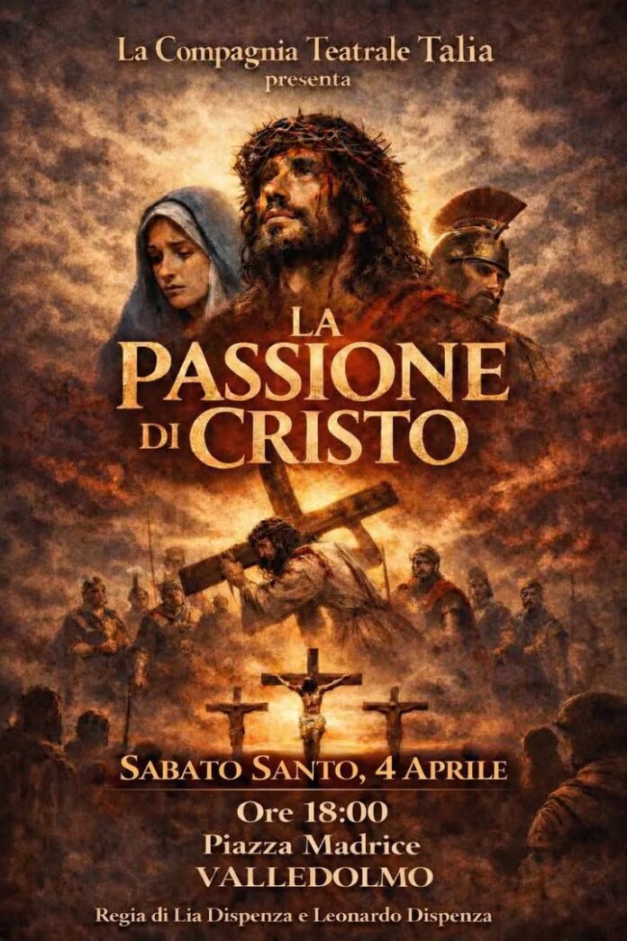 A Valledolmo, dopo tanti anni di assenza, la tradizione cristiana torna ad emozionare i fedeli con la rappresentazione scenografica de “LA Passione di Cristo”. Voluta fortemente dalla Compagnia Teatrale TALIA, la cui regia è curata da Lia Dispenza e Leonardo Dispenza, scritta e adattata da Cettina Aiello e liberamente ispirato a “Gesù di Nazareth”, ha visto la partecipazione di sessanta attori circa che, per l’occasione, si sono profondamente immedesimati nei rispettivi ruoli.