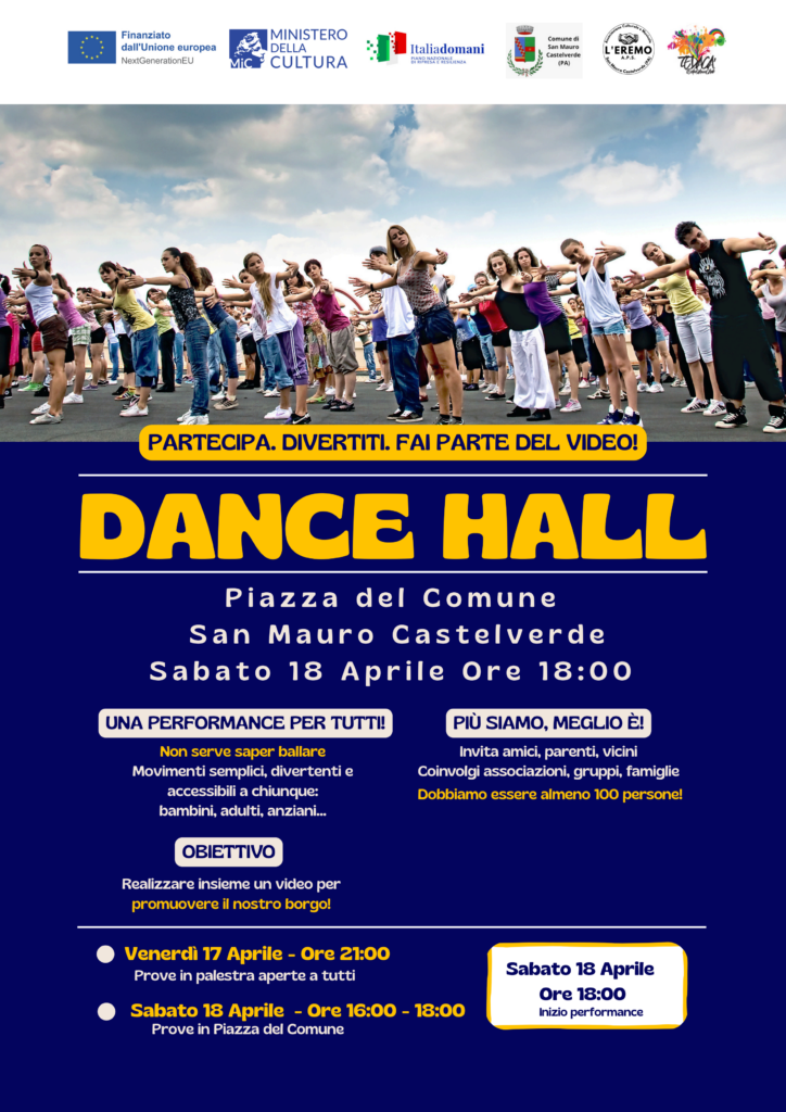 San Mauro Castelverde si prepara a trasformarsi in un grande palcoscenico a cielo aperto con “Dance Hall”, un evento partecipativo che punta a coinvolgere cittadini di tutte le età in una performance collettiva all’insegna della musica, del divertimento e della promozione del territorio.L’iniziativa, in programma sabato 18 aprile alle ore 18:00 nella piazza del paese, nasce con l’obiettivo di realizzare un video promozionale del borgo attraverso una coreografia condivisa, semplice e accessibile a tutti. Non è richiesta alcuna esperienza nel ballo: i movimenti saranno facili, coinvolgenti e adatti a bambini, adulti e anziani.