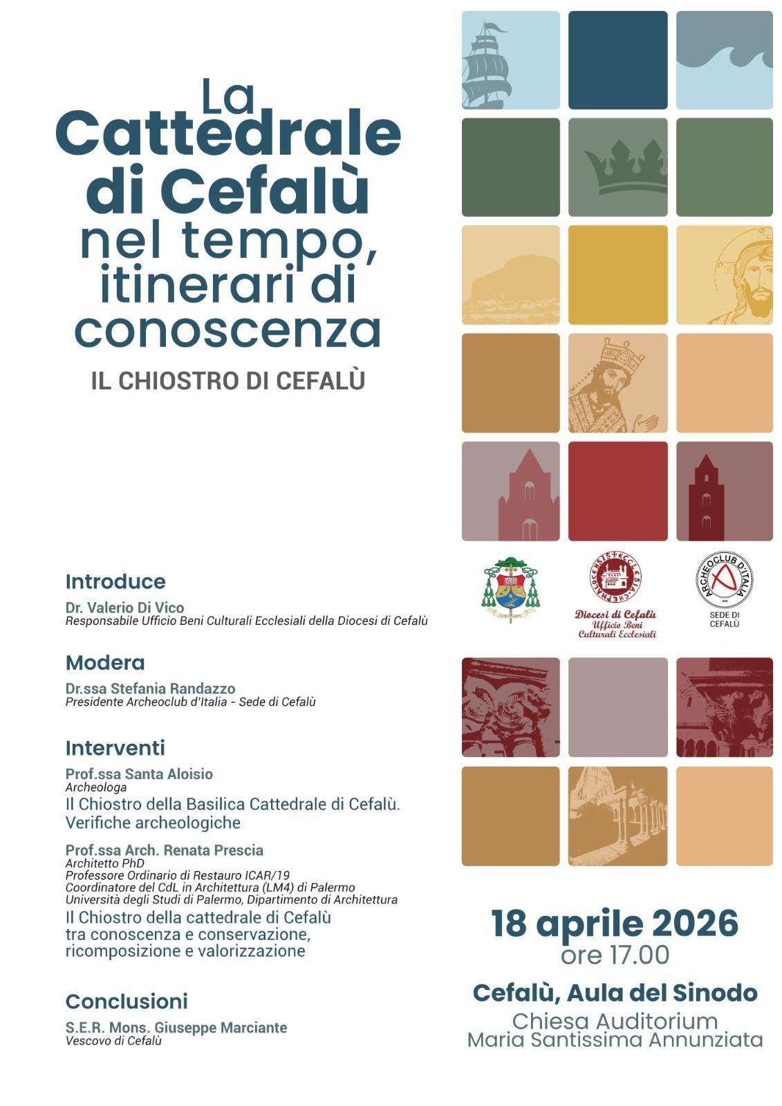 Si terrà sabato 18 aprile 2026, alle ore 17, l’incontro dal titolo “La Cattedrale di Cefalù nel tempo, itinerari di conoscenza. Il Chiostro di Cefalù”, promosso dall’Ufficio Beni Culturali Ecclesiali della Diocesi di Cefalù in collaborazione con l’Archeoclub d’Italia – sede di Cefalù.