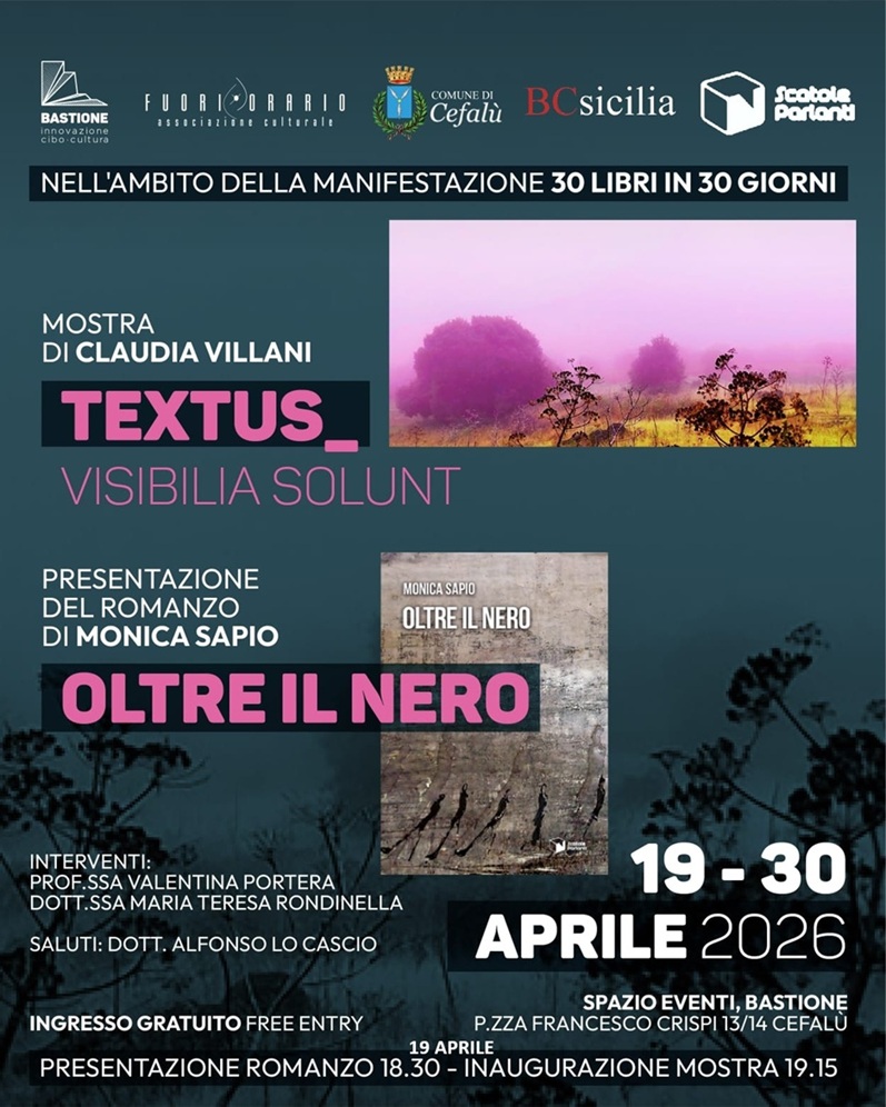 TEXTUS VISIBILIA SOLUNT dal 19 al 30 aprile 2026 e Presentazione del Romanzo di Monica Sapio il 19 aprile ore 18:30 OLTRE IL NERO.