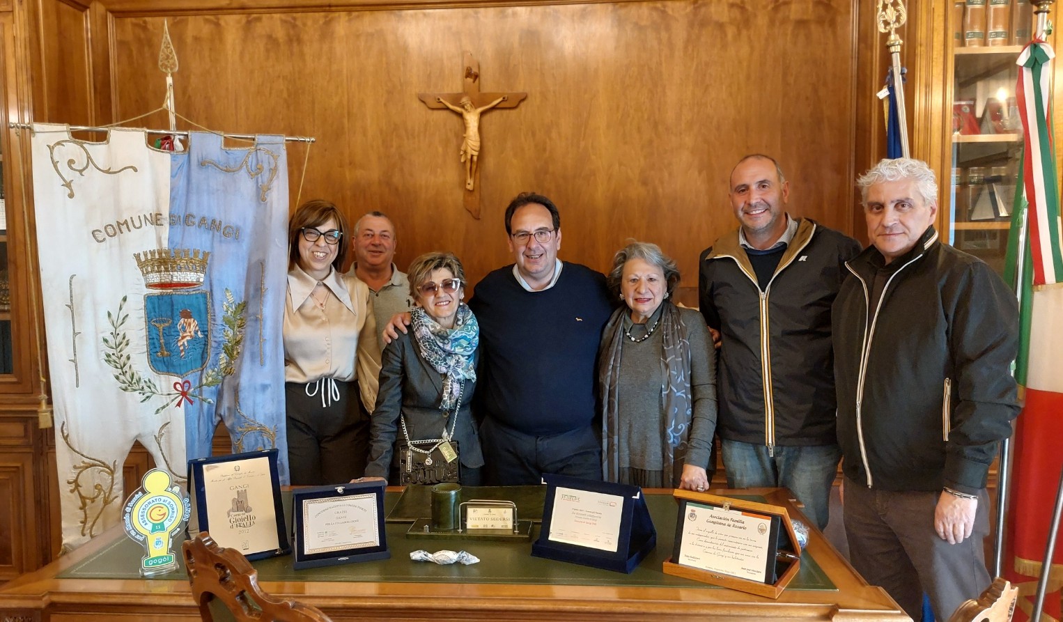 L’atto è stato firmato davanti al notaio Maria Maddalena Brucato. A testimoniare l’importanza del momento era presente anche il sindaco di Gangi, Giuseppe Ferrarello, che ha voluto accoglierla con un gesto simbolico ma significativo: la spilla con il simbolo del Comune, consegnata come segno di appartenenza e gratitudine.